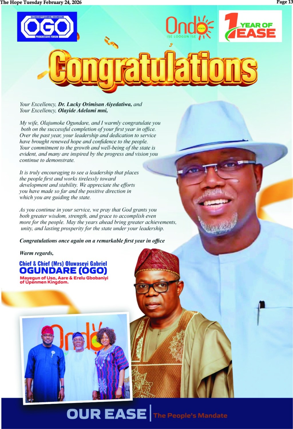 16th February,2026His Excellency, Dr.Orimisan Aiyedatiwa,Executive Governor of Ondo State,Alagbaka, Akure. Your Excellency,Resignation from Appointment as Special Assistant on Special Duties.… READ MORE