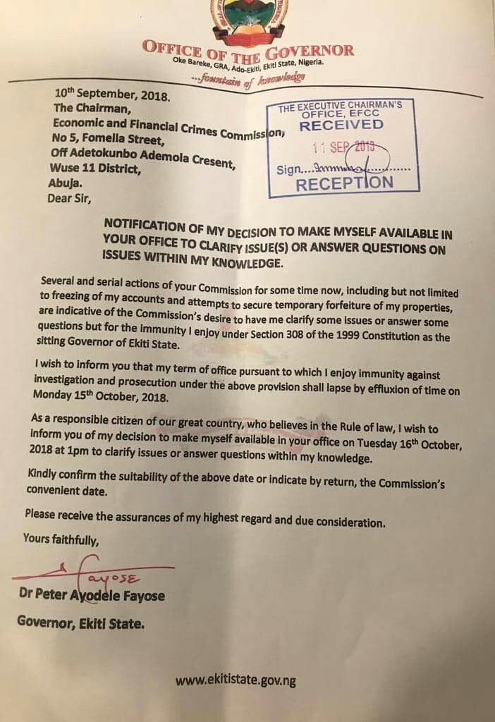 The outgoing governor of Ekiti state, Mr Ayodele Fayose two days ago took to his twitter account and expressed his readiness to make himself available for questioning in the headquarters of the Economic and Financial Crimes Commission, EFCC immediately his tenure expires comes October 2018.