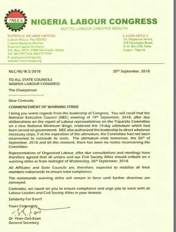 As the 14 days ultimatum given to the Federal government of Nigeria to effect the new minimum wage elapses tomorrow by the Nigeria Labour Congress, the union has directed workers across the nation to embark on indefinite strike beginning from midnight of Wednesday 26th September.