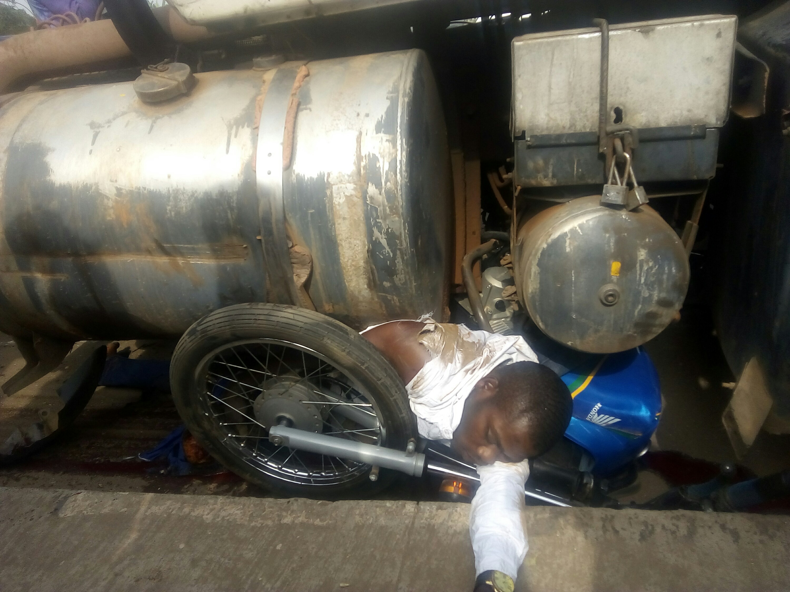 Some said his blood brother was with him on the okada but was lucky to jump off the bike, while Kayode was trapped in-between the two front tires of the tanker with parts of his body chattered into pieces.