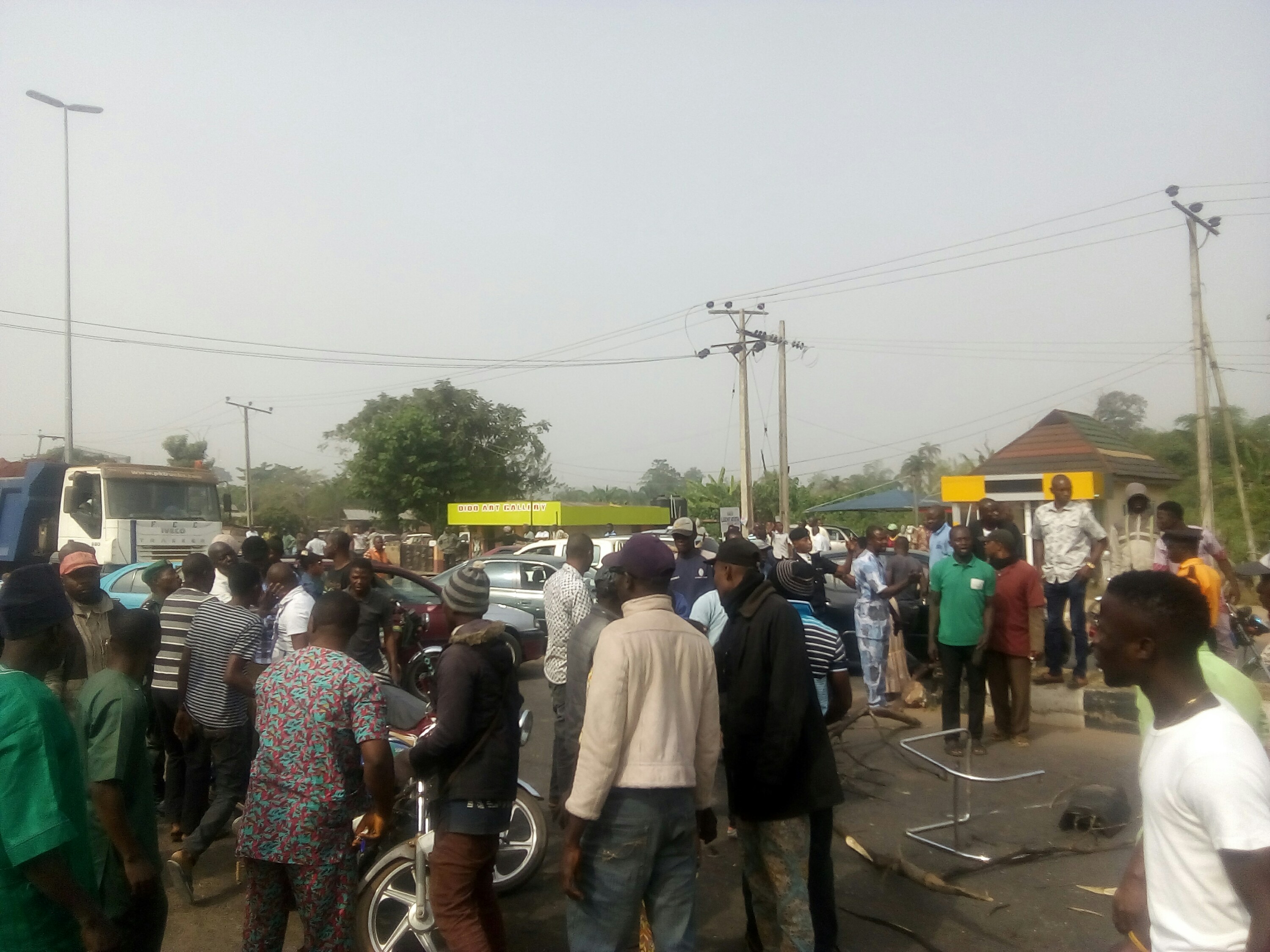 Officers of the Federal Road Safety Corps rushed to the scene with ambulance trying to remove his remains from the tanker, as angry Okada riders descended on the driver and his partner but Policemen were able to rescue them before they took law into their own hands.