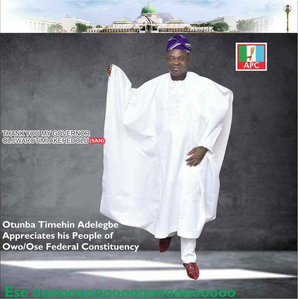 The House of Representatives member-elect for Owo/Ose federal constituency, Otunba Timehin Adelegbe has appreciated the people of the area for the confidence reposed in him by giving him their votes.