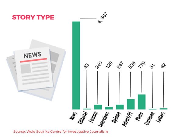 Education stories published in the period were largely straight news. News accounted for 4,567 (68.8 per cent) of the 6,636 education stories published during the period, and this was followed by photos, most of which were event-based. Again, many of the stories were played down in the inner pages of the newspapers. Out of 1,574 total number of headlines recorded during the period, only 43, representing about three out of every hundred headlines was used for education.