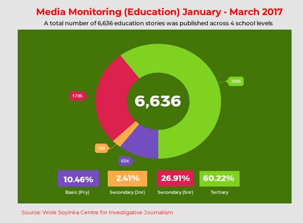 Analysis of data on school levels shows that stories on basic education were low compared to those of tertiary and senior secondary education, with tertiary education aloneaccounting for 3,996 (60.22 percent) of the 6,636education stories published in the period under review.