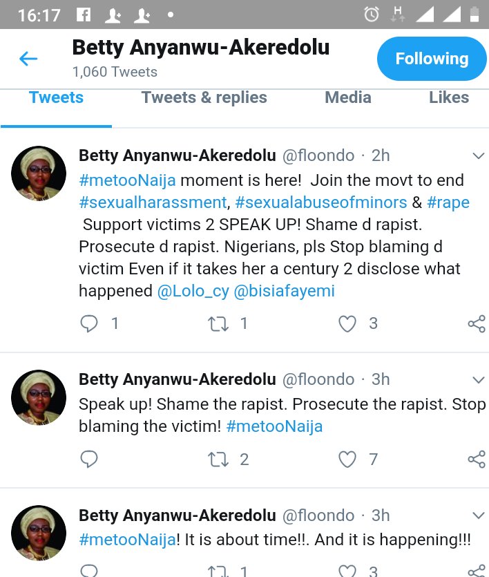 “Even if it takes her a century to disclose what happened. #metooNaija is a movement. Join us to end senseless #sexual harassment, #sexualabuseofminors and #rape in Nigeria”. She posted online through WhatsApp and Twitter networks.