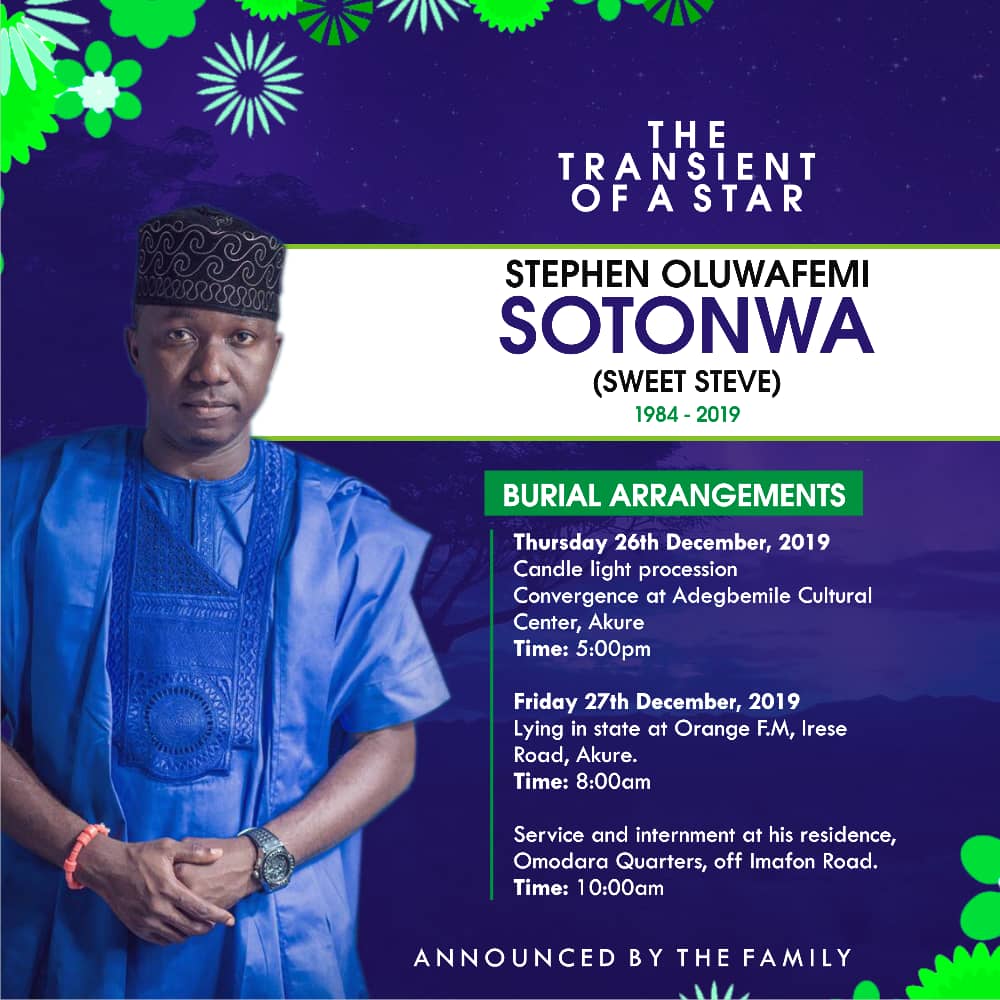 The remains of Multiple Award Winning Broadcaster, Ace Stand-Up Comedian and Talented Compere, Oluwafemi Stephen Sotonwa alias Sweet Steve will be interred on Friday, 27th December, 2019.