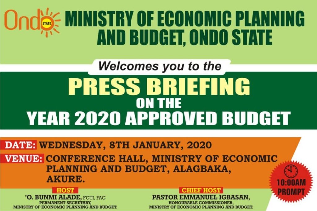 Analysing the 2020 approved budget to journalists in Akure the Ondo state Capital, today, the Commissioner for Economic Planning and Budget, Pastor Emmanuel Igbasan stated that the budget was designed to leapfrog the state’s economy in all sectors, and to further deliver the dividends of democracy to the people.