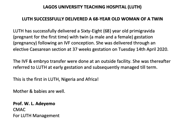 LUTH has successfully delivered a sixty-eight (68) year old primigravida (pregnant for the first time) with twin (a male and a female) gestation (pregnancy) following an IVF conception. She was delivered through an elective caesarean section at 37 weeks gestation on Tuesday April 14, 2020,” the statement read.