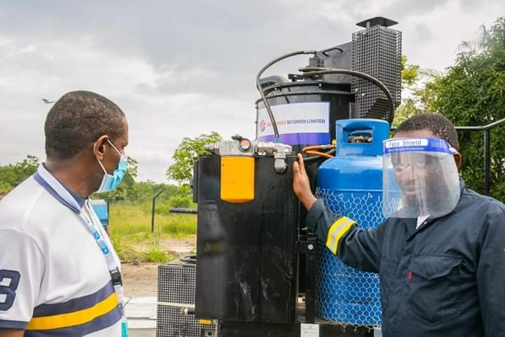 Ondo State Commissioner for Information and Orientation, Hon. Donald Ojogo inspects some newly arrived production equipment at the bitumen yard at Irele, the headquarters of Irele Local Government Area of Ondo state.