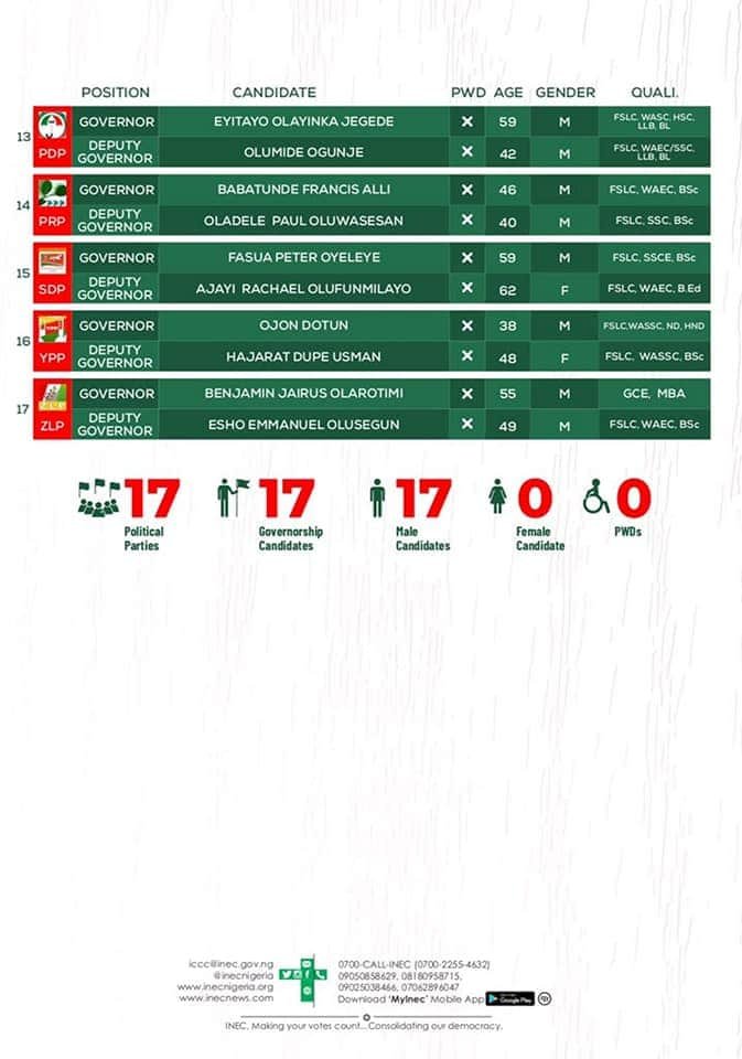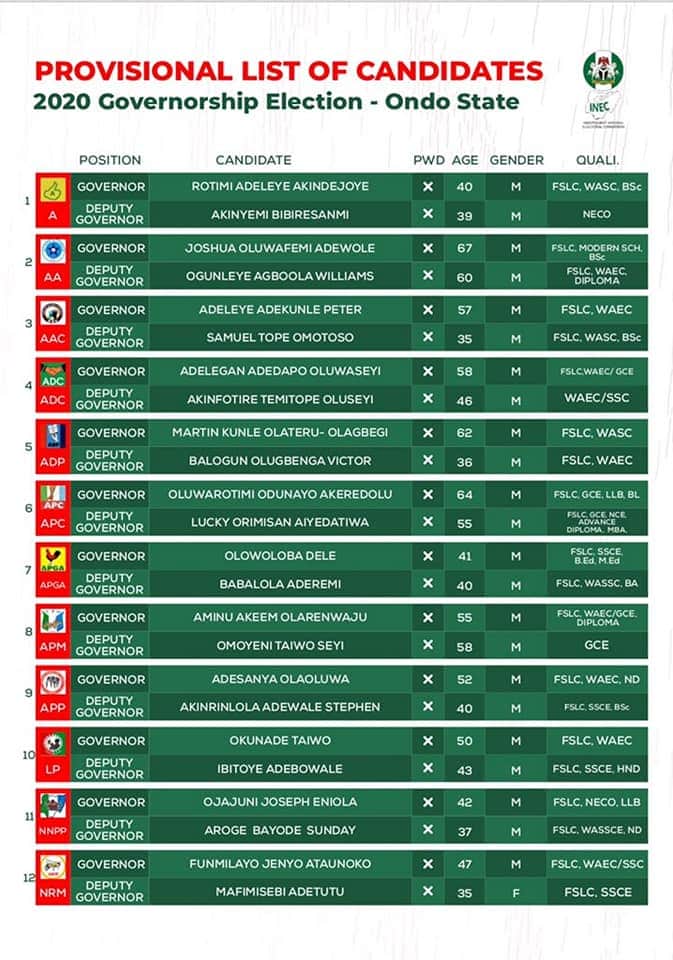 The Independent National Electoral commission, INEC has released the names of political parties’ candidates and their running mates for the October 10, 2020 gubernatorial election in Ondo State.