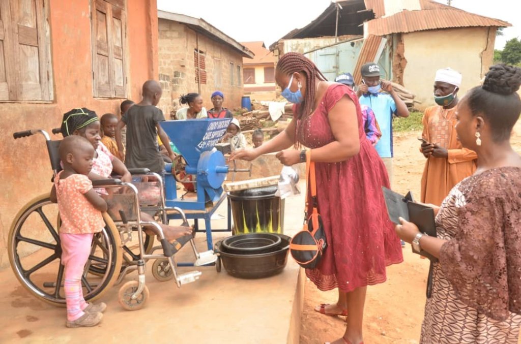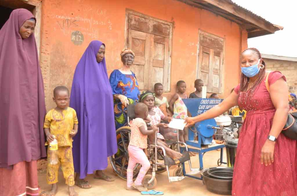 Mrs Akeredolu who discovered her during the just concluded distribution of palliatives to widows across the state, went back to OkeAgbe town today and presented a grinding machine and its accessories, including cash gift to the physically challenged widow.
