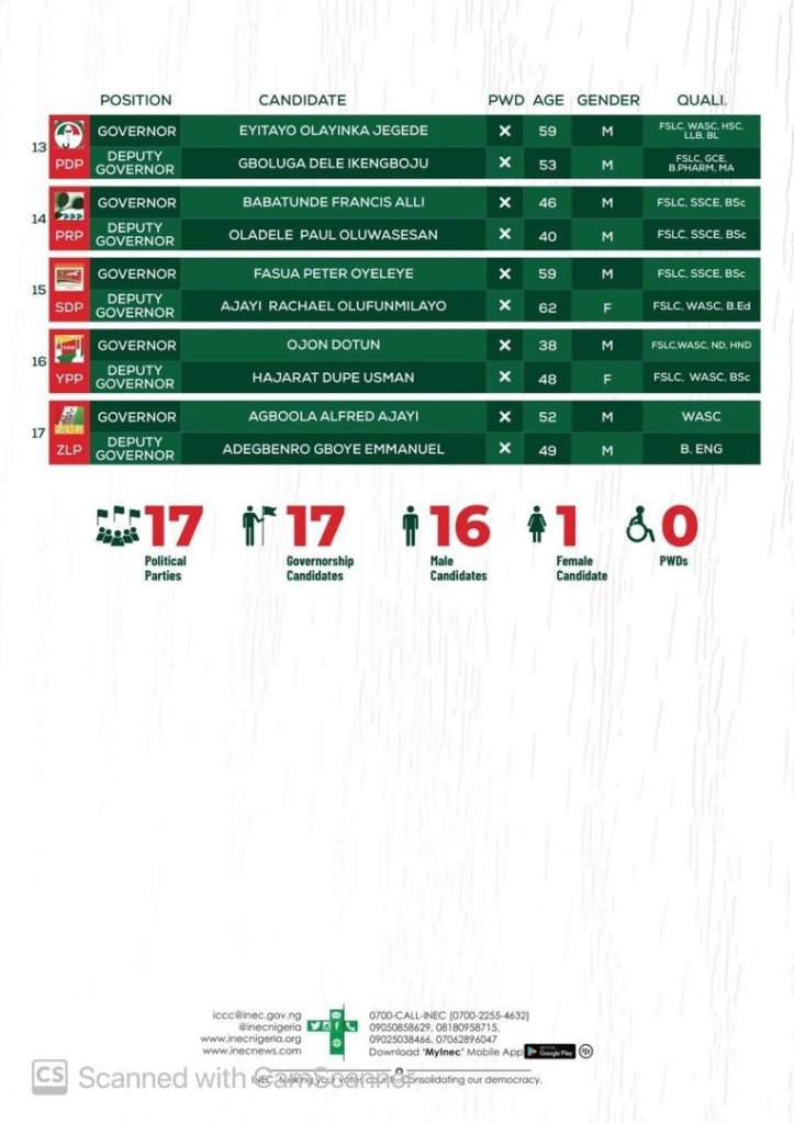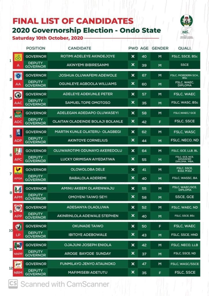 The Independent National Electoral Commission (INEC) has released the final list of nominated candidates for the Ondo State governorship election slated for October 10.