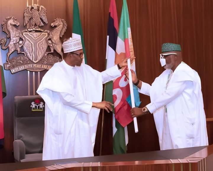 President Muhammadu Buhari presents APC Party flag to Ondo Governor and Candidate, Arakunrin Oluwarotimi Akeredolu Aketi, SAN during the Presentation of Party flag by the President to the ONDO Governorship Candidate held at the State House.