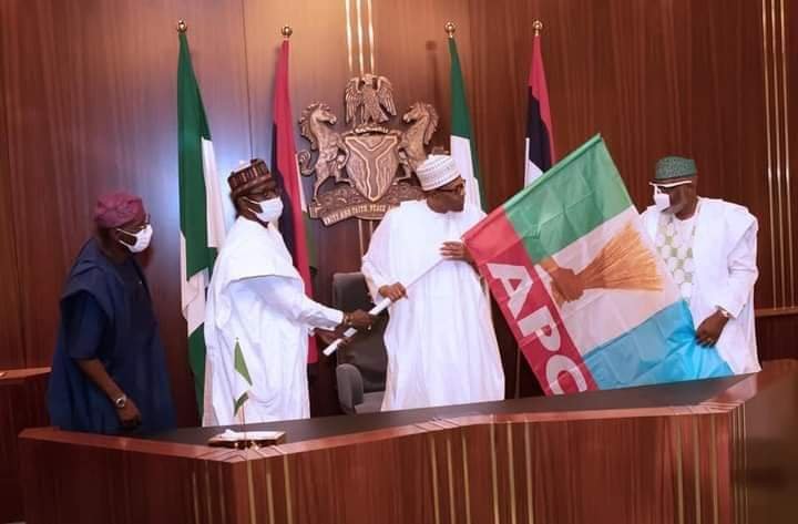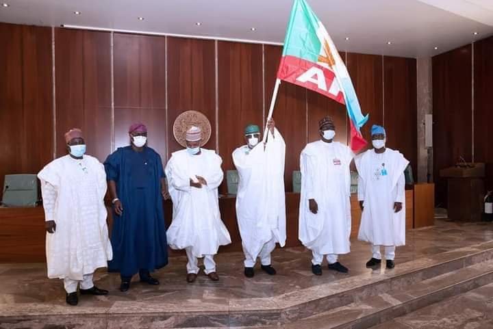 Plateau State Governor, Mr Simon Lalong, The Ondo Governor and Candidate, Arakunrin Rotimi Akeredolu, President Muhammadu Buhari, Chairman APC Caretaker/Special Convention Committee and Governor of Yobe State Mai Mala Buni and Lagos State Governor, Mr BabaJide Sanwo-Olu during the Presentation of Party flag by the President to the ONDO Governorship Candidate held at the State House.
