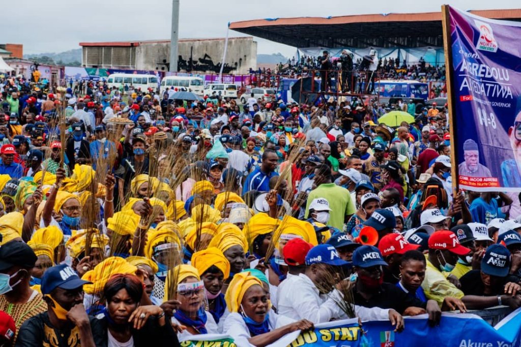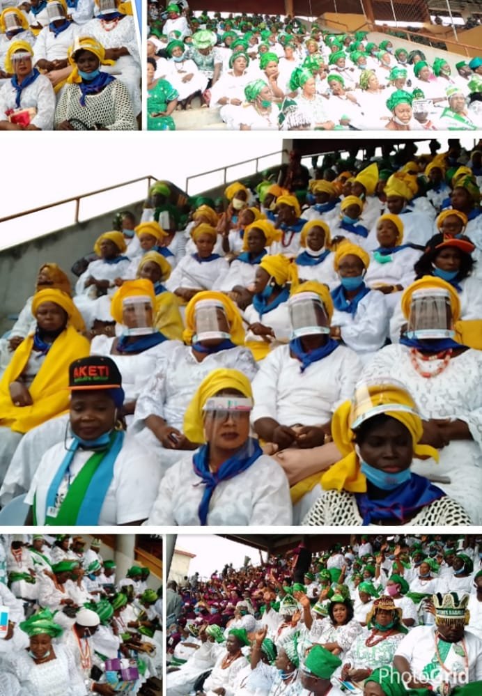 Despite the rainy atmosphere, lovers of Akeredolu, party members, Iyalojas, members of the NURTW, RTEAN, and so many social and political groups filled the stadium to the brim, dancing as the popular musician, Yinka Ayefele and some local upcoming artistes entertained them.