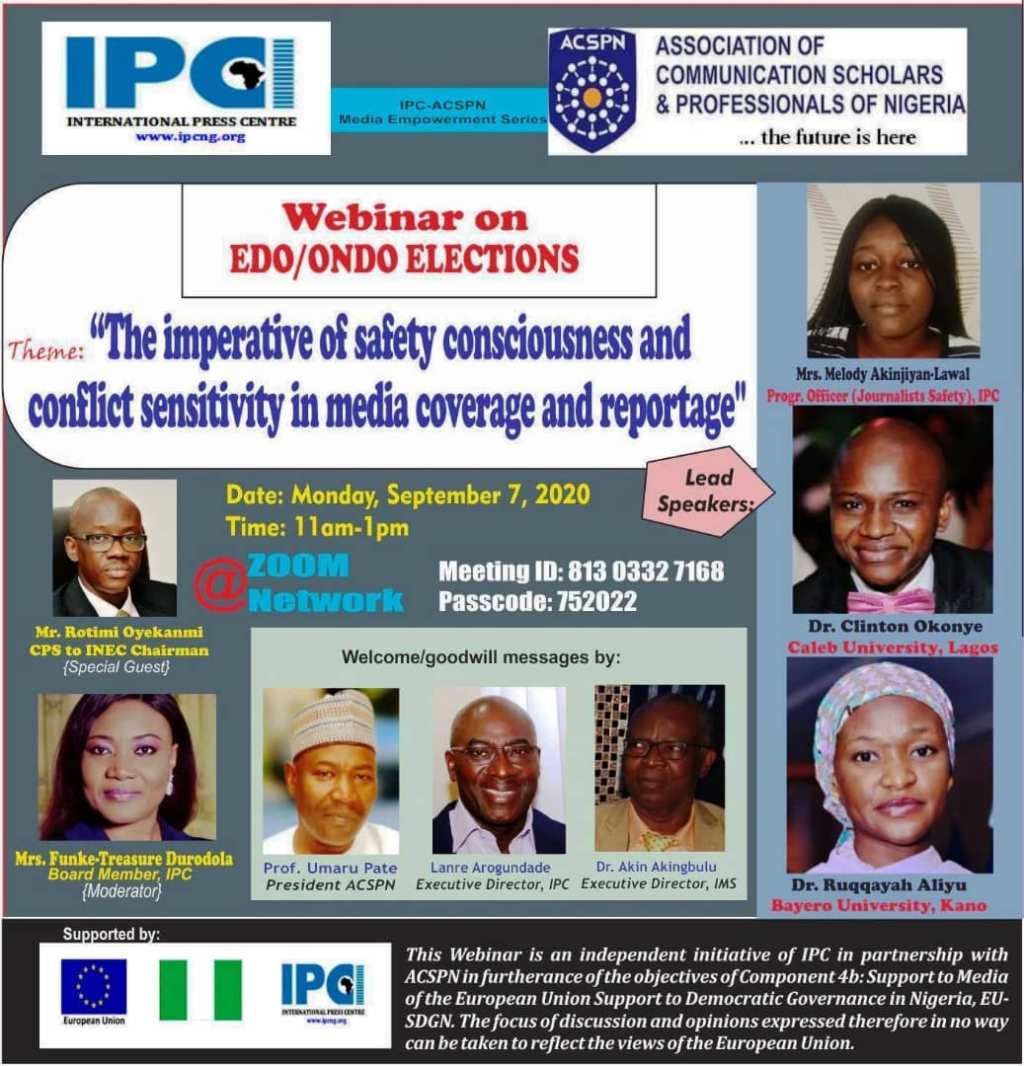 As the gubernatorial election in Edo and Ondo states move more closer, the need for Journalists to take precautionary measures and be well kitted while discharging their duties, formed the decision of the International Press Centre, in partnership with the Association of Communication Scholars and Professionals of Nigeria to engage Journalists in two hours intensive training.