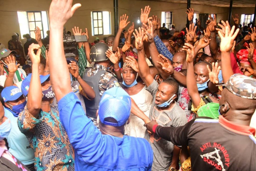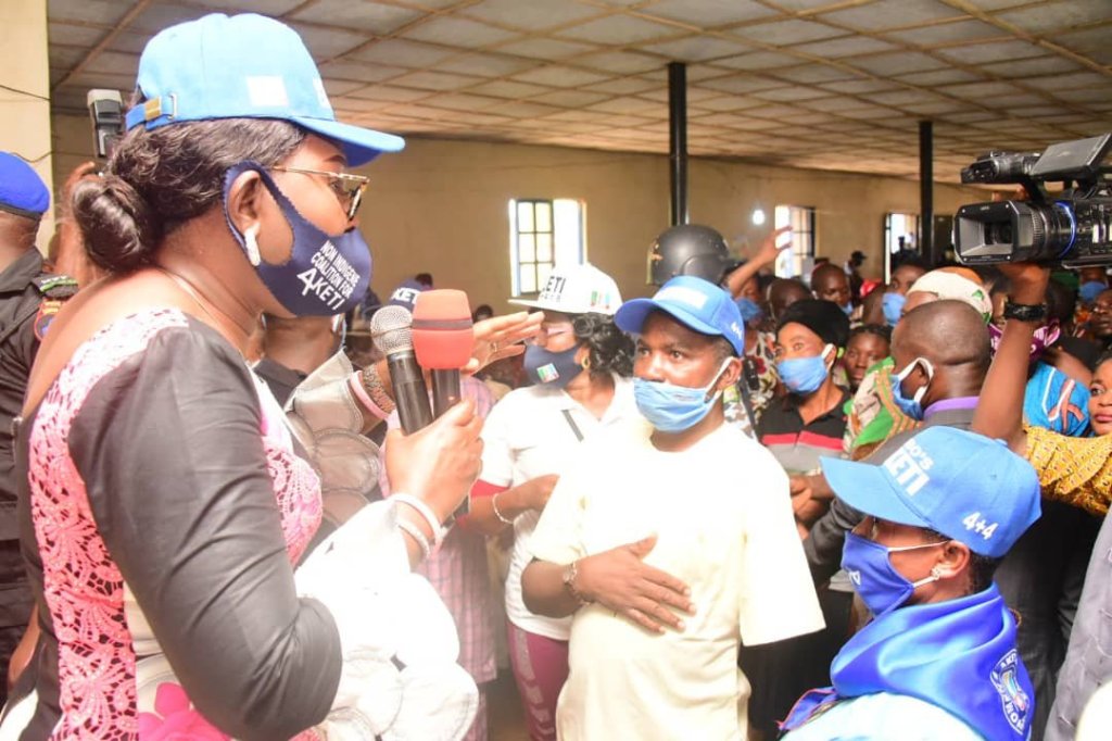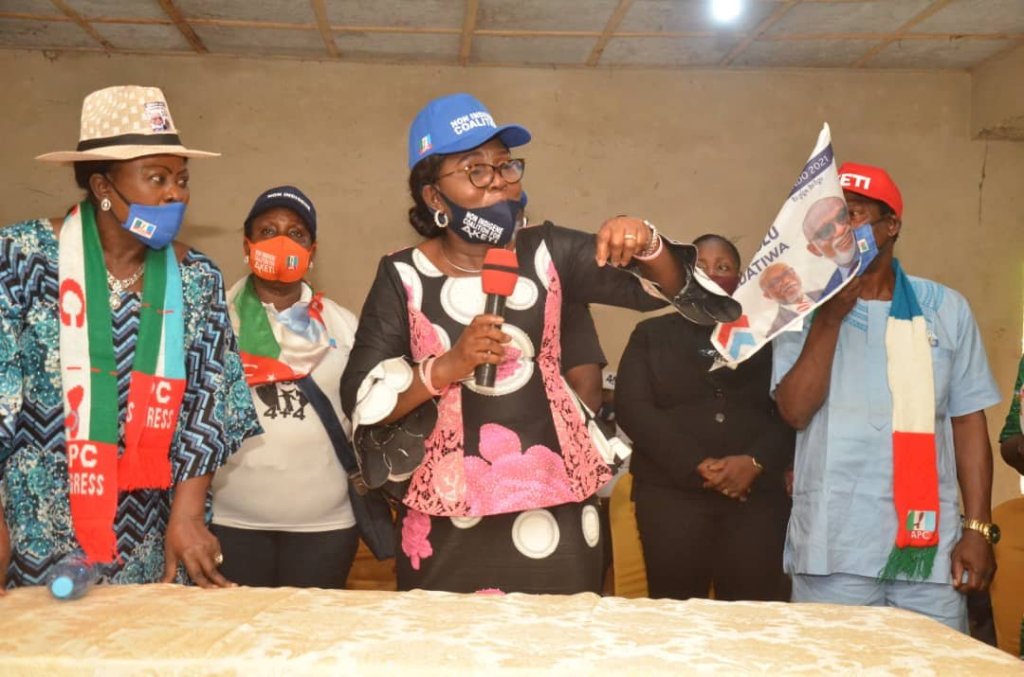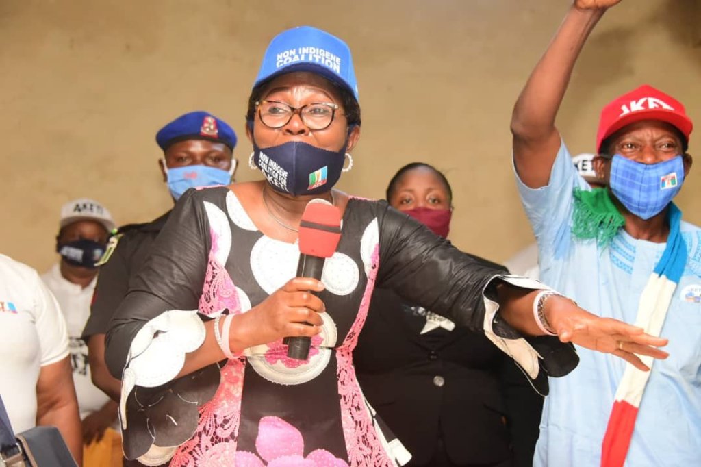 The wife of Ondo State Governor, Arabinrin Betty Anyanwu-Akeredolu, was today given a warm reception at Oniparaga Community in Odigbo Local Government area of the state, where she received hundreds of Non-indigenes into the camp of the All Progressive Congress party, through the Coalition of Non-indigene for AKETI.