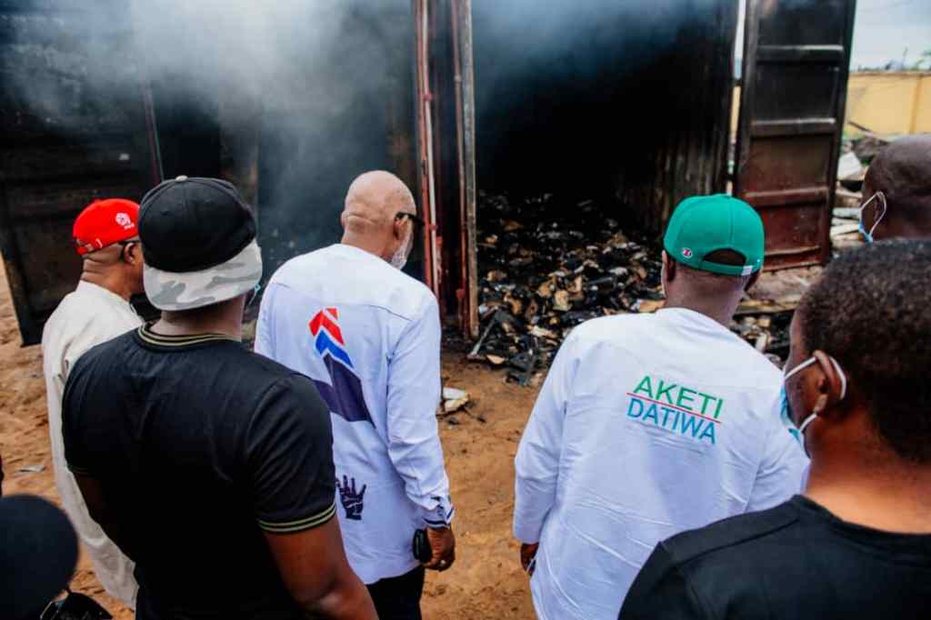 Governor Akeredolu was accompanied to the scene of the fire incident by his running mate, Hon. Lucky Aiyedatiwa.