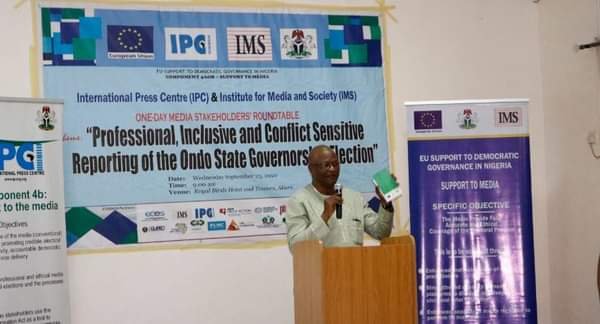 This charge was given at the Stakeholders’ Media RoundTable organised by the International Press Centre (IPC), in collaboration with the Institute for Media and Society, for Journalists in Ondo State on ‘Professional, Inclusive and Conflict Sensitive Reporting of the Ondo State Governorship Election’, held at the Royal bird Tower Alagbaka Akure, the state capital.