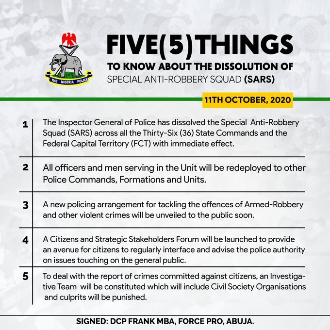 “The Special Anti-Robbery Squad of the Nigerian Police, otherwise known as SARS, is hereby dissolved across all formations, the 36 state police command and the Federal Capital Territory where they currently exist,” the IGP said.