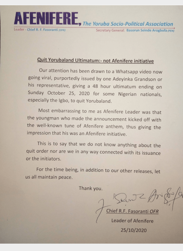 The Yoruba Socio-political group, Afenifere, has denied the viral video with the ‘Quit Yorubaland ultimatum.