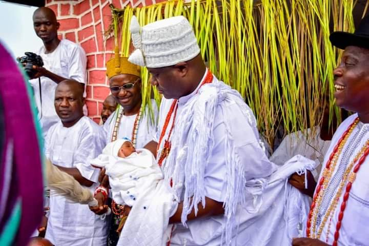 After receiving his son from the mother, Ooni Ogunwusi accompanied by relevant spiritual aides swiftly took the baby straight into the inner chamber of ILE IGBO for the necessary spiritual confirmation to establish the blood lineage of Oduduwa our progenitor following the foots steps of his ancestors.