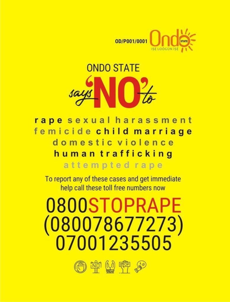 Highlighting the steps taken by her office at tackling the menace, Mrs Akeredolu disclosed that an emergency response team centre and toll-free number in Ondo State had been set up, including the provision of a Yellow Card for school girls as a preventive strategy to stop the menace.