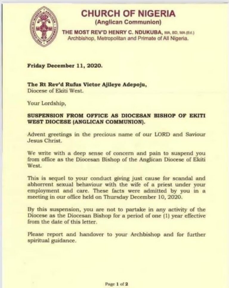 The Church of Nigeria, Anglican Communion has suspended the Bishop of the Diocese of Ekiti West, The most Reverend Rufus Ajileye Adepoju.