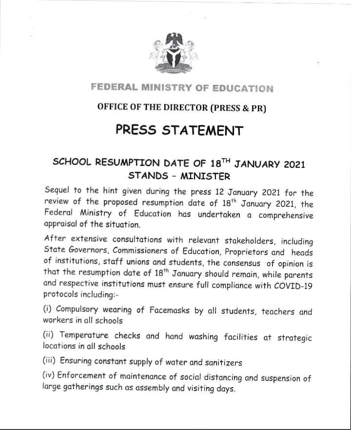 The Federal Government of Nigeria had insisted on the January 18 resumption date for reopening of schools across the country.