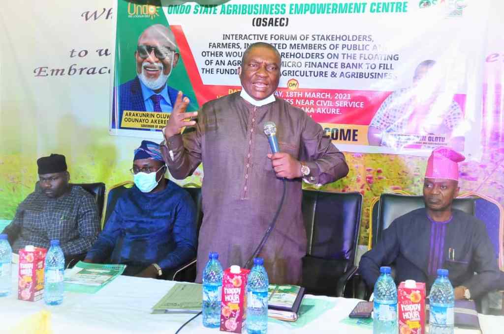 The Senior Special Assistant (SSA) to the Governor on Agribusiness, Pastor Akin Olotu disclosed this on Thursday in Akure at an interactive forum of stakeholders and Farmers on floating of Agriculture Micro finance bank to fill the funding Gap in Agriculture and Agribusinesses.