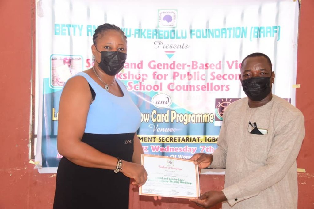 The Betty Anyanwu-Akeredolu Foundation, BAAF, has captured six out of the 18 Local Government areas of Ondo State for the distribution of 400,000 Sexual and Gender-Based Violence’s Protective Yellow Cards for secondary school girls, and the training of Schools’ Counsellors.