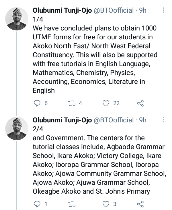 He said: “We have concluded plans to obtain 1000 UTME forms for free for our students in Akoko North East/ North West Federal Constituency. This will also be supported with free tutorials in English Language, Mathematics, Chemistry, Physics, Accounting, Economics, Literature in English