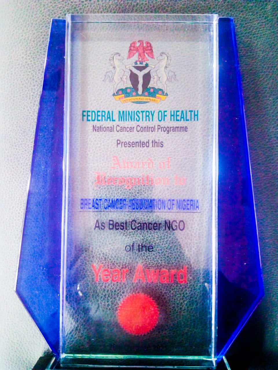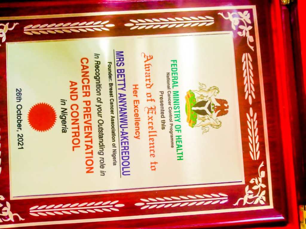 The association, Tuesday, was singled out for the prestigious award given by the Federal Ministry of Health in recognition of its strides in the fight against the scourge of breast cancer in Nigeria, being part of the activities at the ongoing 2021 Cancer International Week in Nigeria, holding at NAF Conference Centre & Suites, Ahmadu Bello Way, FCT, Abuja.