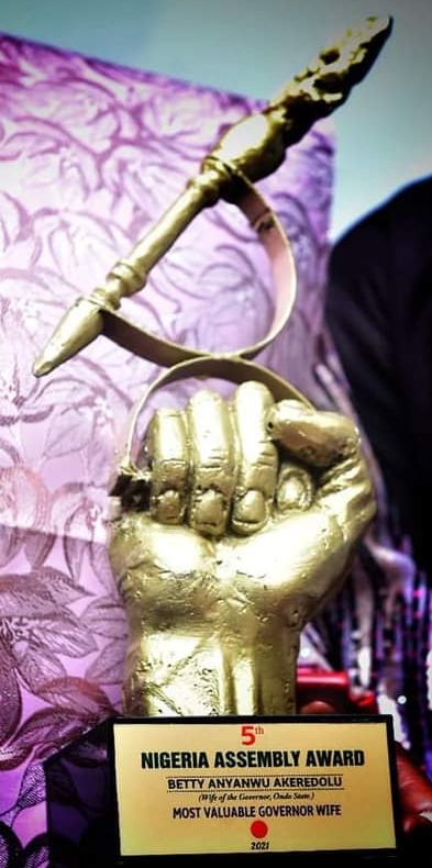 Ondo State first Lady, Chief (Mrs) Betty Anyanwu-Akeredolu was on Wednesday, honoured with the ‘Most Valuable Governor’s wife’ Award, at the 5th Edition of Nigeria Assembly Orientation and Awards Dinner 2021, themed: “Bridging the Gap among Legislature, Executive and Judiciary Expending Solution to the Nigeria’s Many Problems”, held at Merit House, Maitama, Abuja.