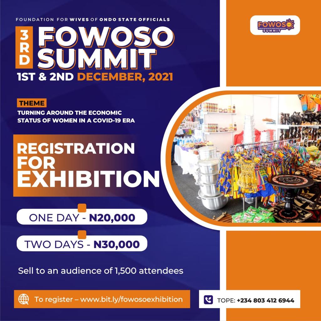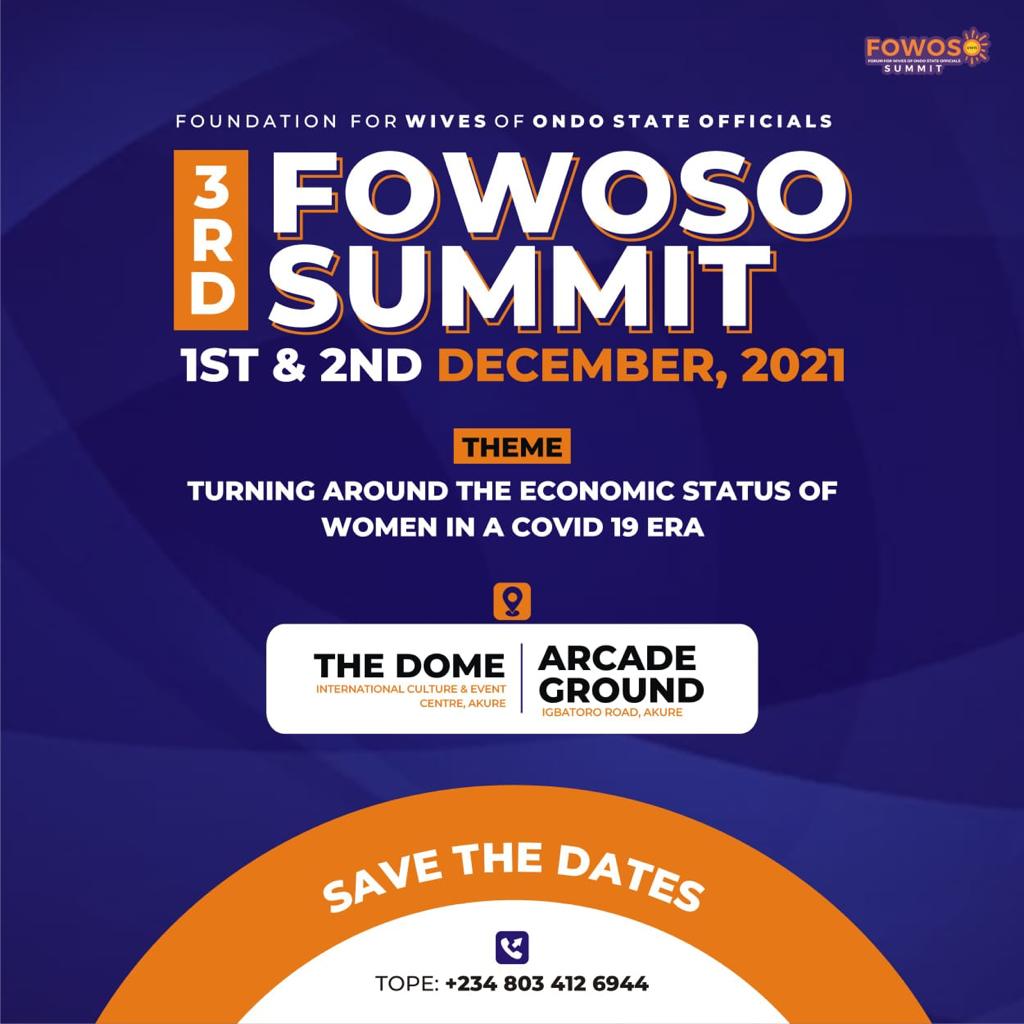 All is set for the 3rd Summit of the Foundation for Wives of Ondo State Officials (FOWOSO) scheduled to hold at the International Culture and Events Centre (The DOME) and the Arcade Ground, Igbatoro, Akure, on the 1st and 2nd December 2021.