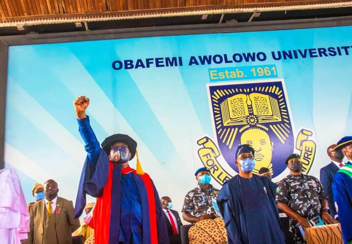 Other dignitaries at the event include the Governor of Osun State, Adegboyega Oyetola, the Ooni of Ife Oba Adeyeye Enitan Ogunwusi, the Etsu Nupe and Chancellor of the university, Alhaji Yahata Abubakar, and the Pro-Chancellor, Owelle Oscar Udoji.