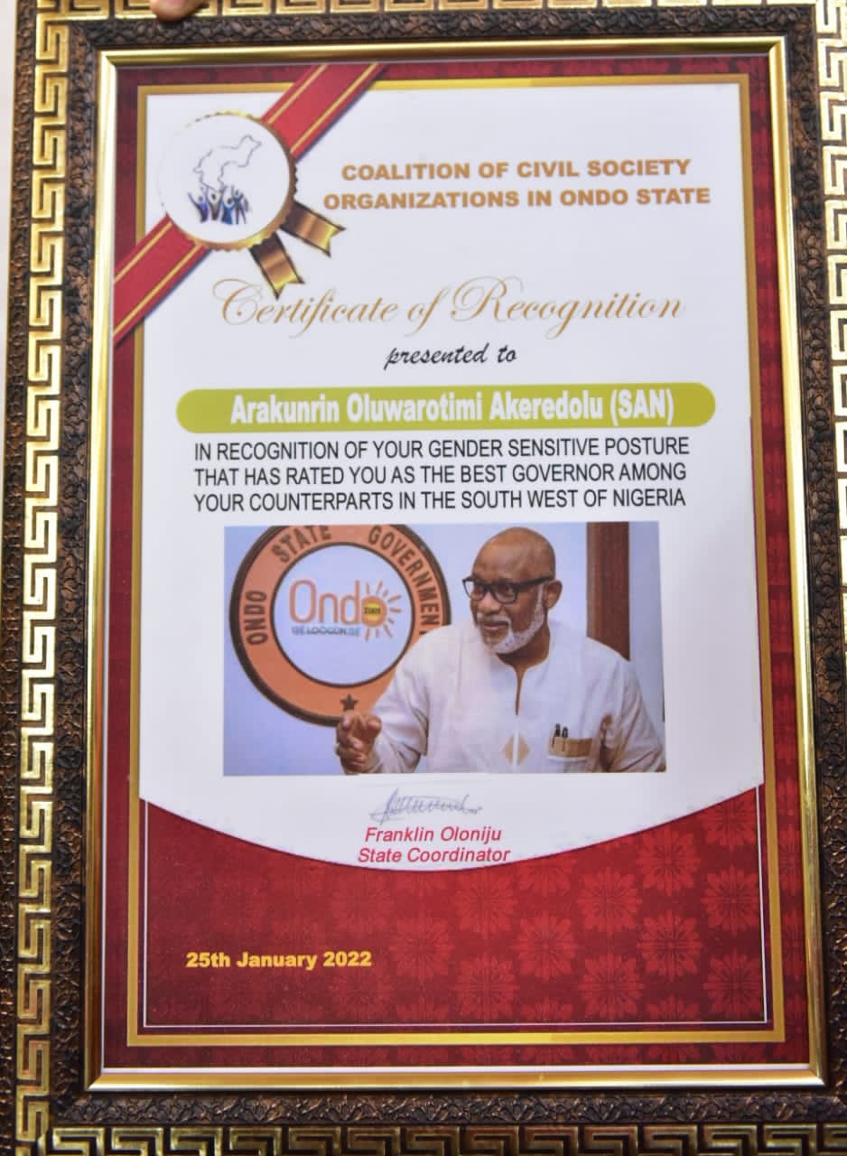 “Certificate of recognition presented to Arakunrin Oluwarotimi Akeredolu SAN in recognition of your gender sensitive posture that has rated you as the best Governor among your counterparts in the South West of Nigeria” .