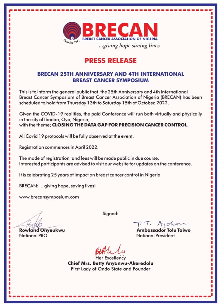 The Breast Cancer Association of Nigeria, BRECAN’s 25th Anniversary and its 4th International Cancer Symposium has been scheduled to hold from Thursday 13th to Saturday 15th of October, 2022.