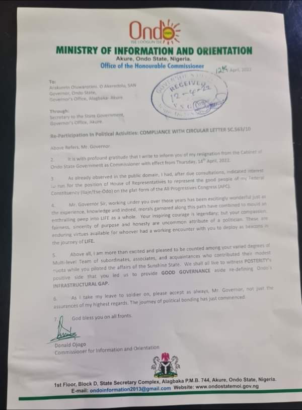 Ondo State Commissioner for Information and Orientation, Hon. Donald Ojogo resigns amidst growing support for his aspiration to contest as Member , House of Representatives (Ilaj/Ese-Odo Federal Constituency).
