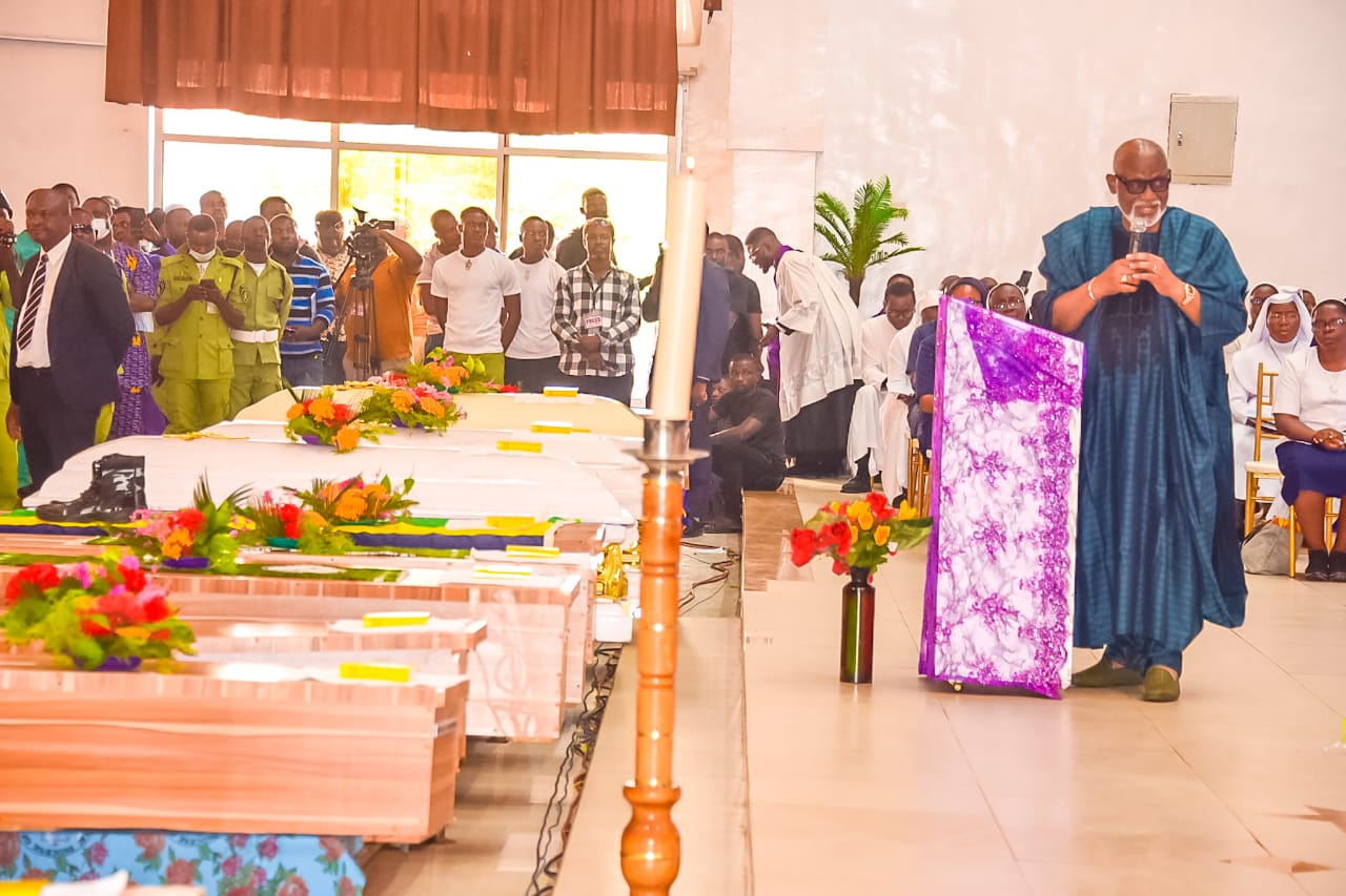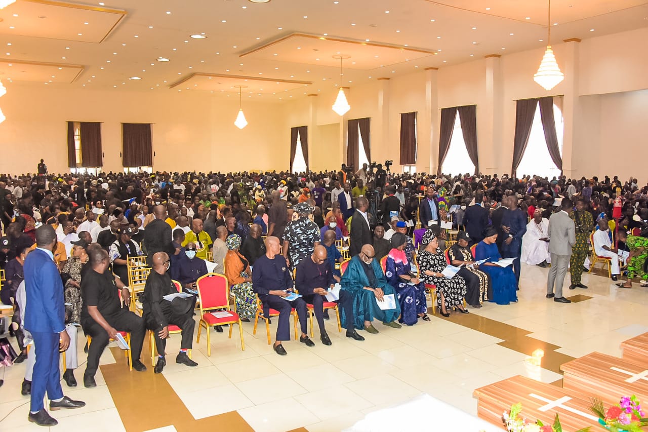 The funeral mass began at 10:00 am after the caskets bearing the bodies of the deceased were brought into the hall of Mydas Resort, Owo.