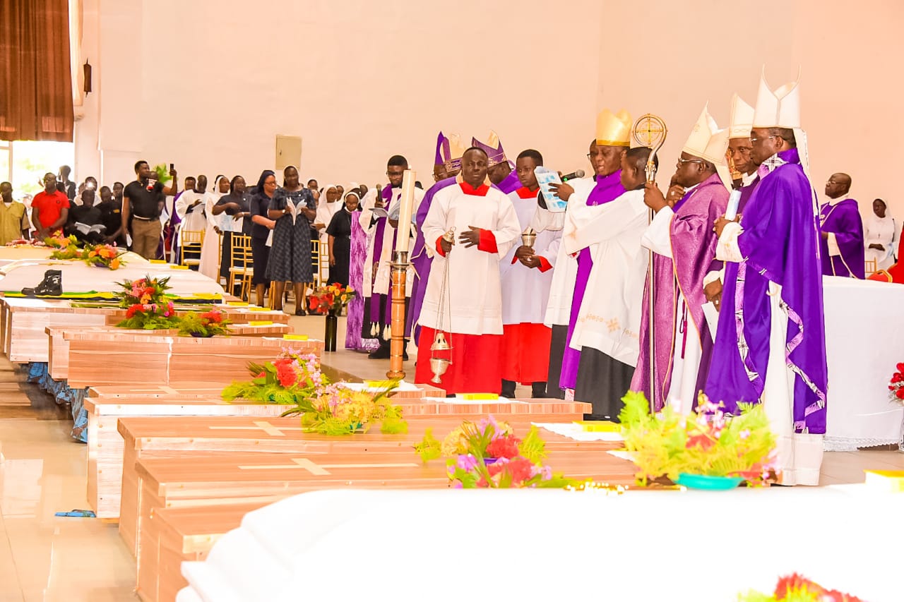 About thirteen days after the terror attack by gunmen on worshippers at Saint Francis Catholic Church, Owo, Ondo State, funeral mass for the deceased victims was held today amidst tears.