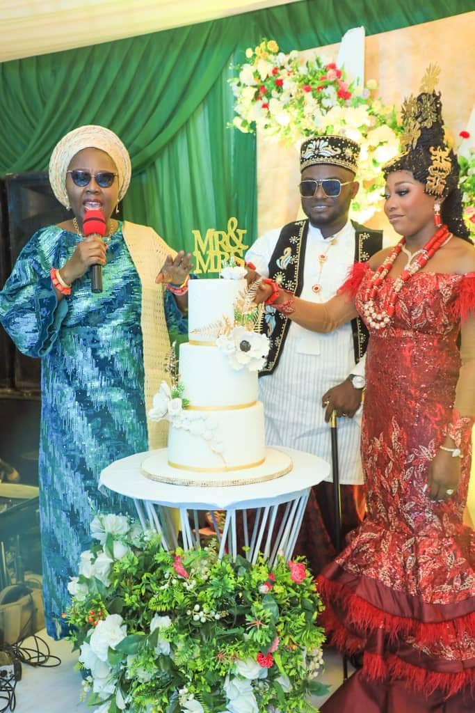 While conducting the cake-cutting being the mother of the day, she charged the newlyweds to give each other space for self-development, saying, by so doing they would have a happy and peaceful home.