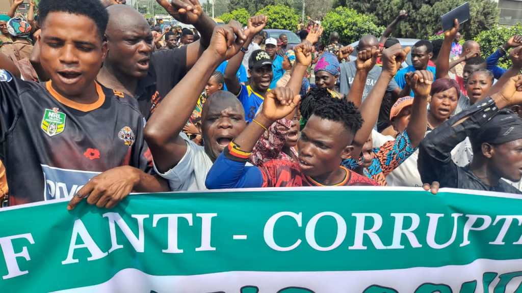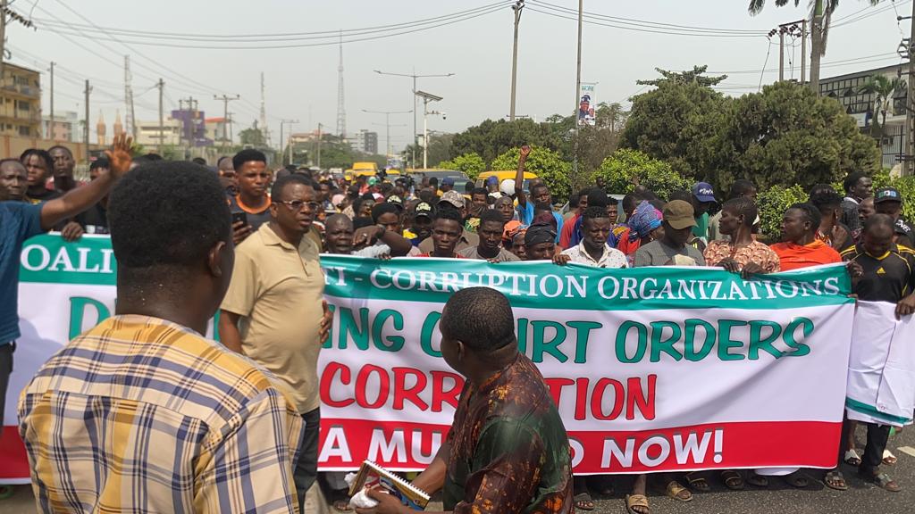 Nigeria’s foremost Anti-corruption Civil Society Organisations, numbering over 100, again, trooped out on the streets of Lagos, on Monday, with thousands of their members and supporters, in continuation of their “Protest Against Politicisation of the Economic and Financial Crimes Commission, Disobedience of Court Orders and Infringement on Human Rights of Nigerians.”