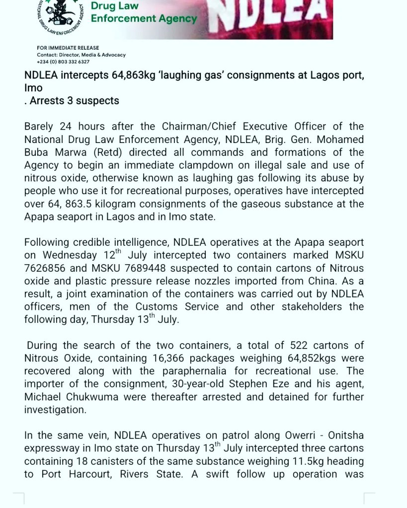 Barely 24 hours after the Chairman/Chief Executive Officer of the National Drug Law Enforcement Agency, NDLEA, Brig. Gen. Mohamed Buba Marwa (Retd) directed all commands and formations of the Agency to begin an immediate clampdown on illegal sale and use of nitrous oxide, otherwise known as laughing gas following its abuse by people who use it for recreational purposes, operatives have intercepted over 64, 863.5 kilogram consignments of the gaseous substance at the Apapa seaport in Lagos and in Imo state.