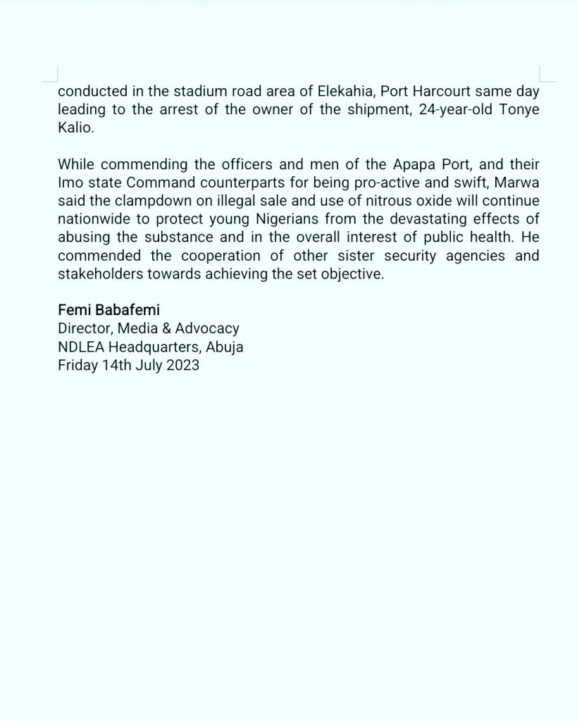 While commending the officers and men of the Apapa Port, and their Imo state Command counterparts for being pro-active and swift, Marwa said the clampdown on illegal sale and use of nitrous oxide will continue nationwide to protect young Nigerians from the devastating effects of abusing the substance and in the overall interest of public health. He commended the cooperation of other sister security agencies and stakeholders towards achieving the set objective.