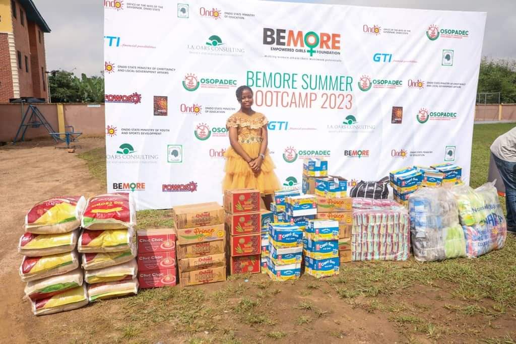 Ireola, who was accompanied by her family members to Mabest Academy, Oke-Ijebu, Akure, Ondo State, venue of the boot camp, where the items were delivered to the foundation, enthused about what she benefited from Bemore. She also thanked the founder and wife of Ondo State Governor, Chief Betty Anyanwu-Akeredolu, for creating the Bemore platform for girl children.