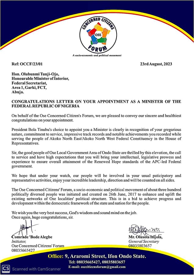 Sir, the good people of Ose Local Government Area of Ondo State are thrilled by this elevation, the call to service and have high expectations that you will bring your intellectual, legislative prowess and experience to ensure overall attainment of the Renewed Hope standards of the APC-led Federal government.