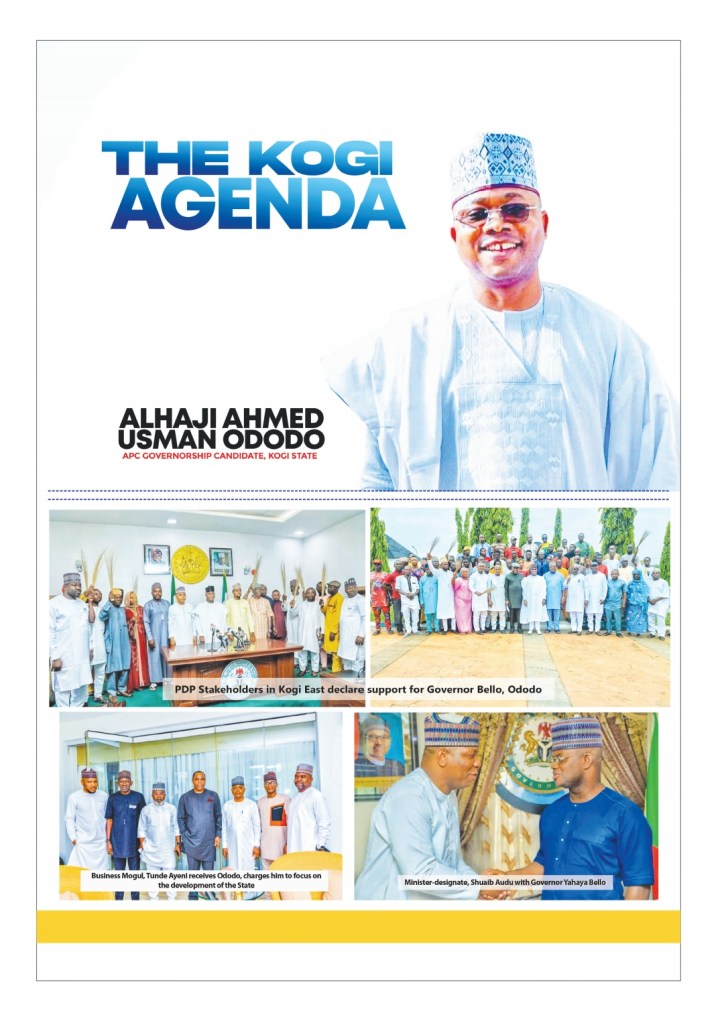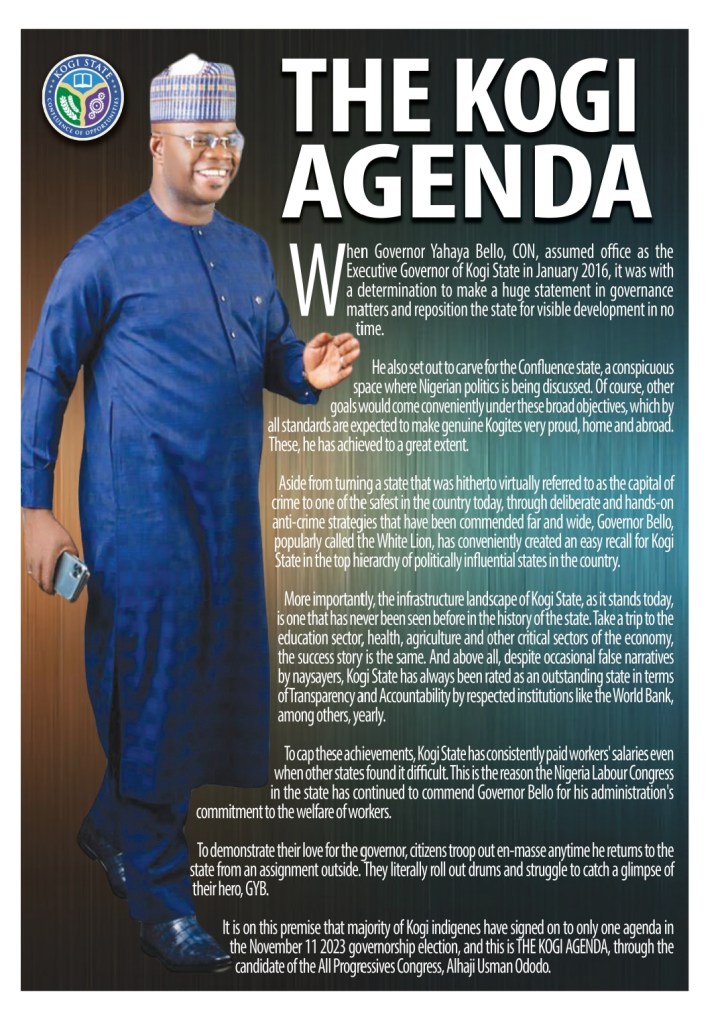 It is on this premise that majority of Kogi indigenes have signed on to only one agenda in the November 11 2023 governorship election, and this is THE KOGI AGENDA, through the candidate of the All Progressives Congress, Alhaji Usman Ododo.