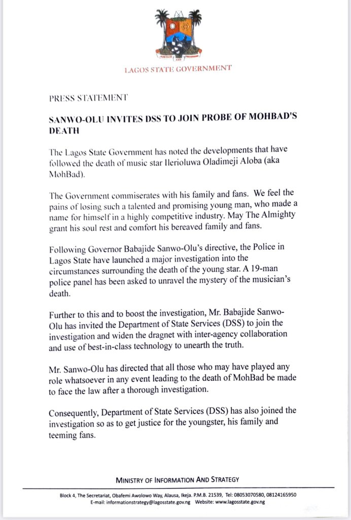I have instructed that all those who may have played any role whatsoever in any event leading to the death of MohBad be made to face the law after a thorough investigation.