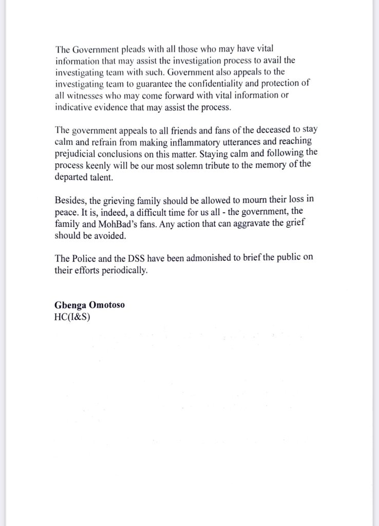 I also appeal to all friends and fans of the deceased to stay calm and refrain from making inflammary utterances and reaching prejudicial conclusions on this matter. Staying calm and following the process will be our most solemn tribute to the memory of the departed talent.